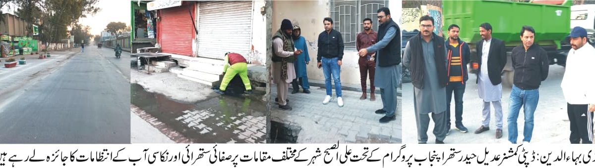 ڈپٹی کمشنر عدیل حیدر نے وزیراعلیٰ پنجاب مریم نواز شریف کے ویڑن ستھرا پنجاب مہم کے تحت علی الصبح روزانہ کی بنیاد پر مختلف علاقوں کا دورہ کیا۔دورے کے دوران انہوں نے گوڑھا محلہ، صوفی پورہ اور جیل روڈ پر صفائی ستھرائی کے انتظامات، کوڑا کرکٹ اٹھانے کے عمل، نکاسی آب اور عملے کی کارکردگی کا تفصیلی جائزہ لیا اور ضروری ہدایات جاری کیں۔ڈپٹی کمشنر نے موقع پر موجود عملے کو ہدایت کی کہ صفائی کے معیار پر کوئی سمجھوتہ نہ کیا جائے اور شہریوں کو صاف ستھرا ماحول فراہم کیا جائے۔ڈپٹی کمشنر عدیل حیدر کا کہنا تھا کہ ستھرا پنجاب مہم عوامی مفاد کا اہم منصوبہ ہے جس کے تحت شہروں اور دیہات میں صفائی کے نظام کو مزید مو¿ثر بنایا جا رہا ہے۔ڈپٹی کمشنر عدیل حیدر نے شہریوں سے بھی اپیل کی کہ وہ صفائی ستھرائی میں انتظامیہ سے تعاون کریں اور کوڑا کرکٹ مقررہ مقامات پر ہی ڈالیں۔