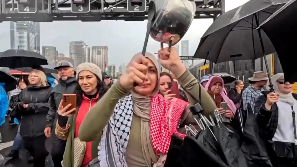 شدید بارش کی مخالفت کرتے ہوئے، ہزاروں مظاہرین نے سڈنی کے ہاربر برج پر مارچ کیا، غزہ میں فوری جنگ بندی اور غیر محدود انسانی امداد کی ترسیل پر زور دیا۔ فلسطینی پرچم لہراتے ہوئے اور بینرز اٹھائے ہوئے مظاہرین نے عالمی رہنماؤں سے بحران کے خاتمے کے لیے تیزی سے کام کرنے کا مطالبہ کیا۔ پرامن احتجاج نے غزہ کے شہریوں کے ساتھ عالمی یکجہتی کو اجاگر کیا۔