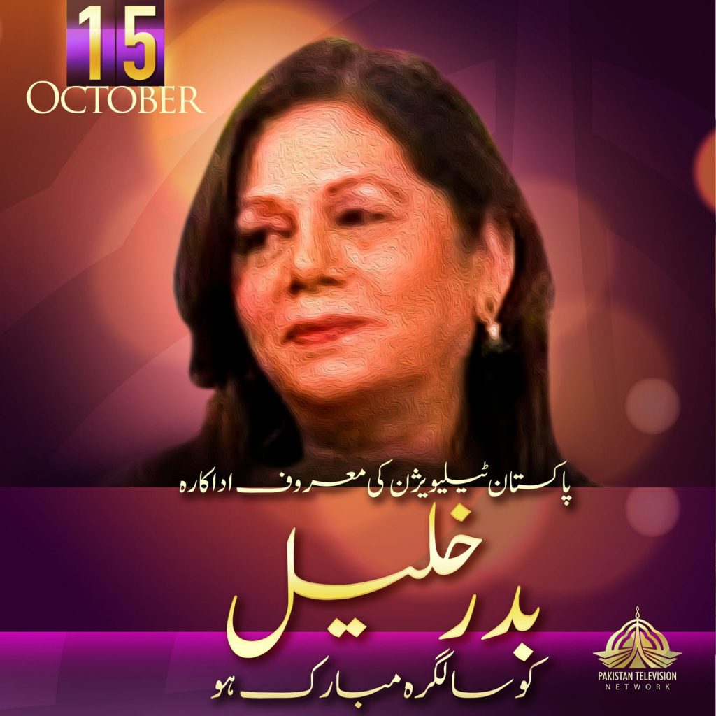 پاکستان ٹیلی ویژن (پی ٹی وی) نے معروف اداکارہ بدر خلیل کی تفریحی صنعت میں ان کی خدمات کو خراج تحسین پیش کرتے ہوئے ان کی سالگرہ منائی۔