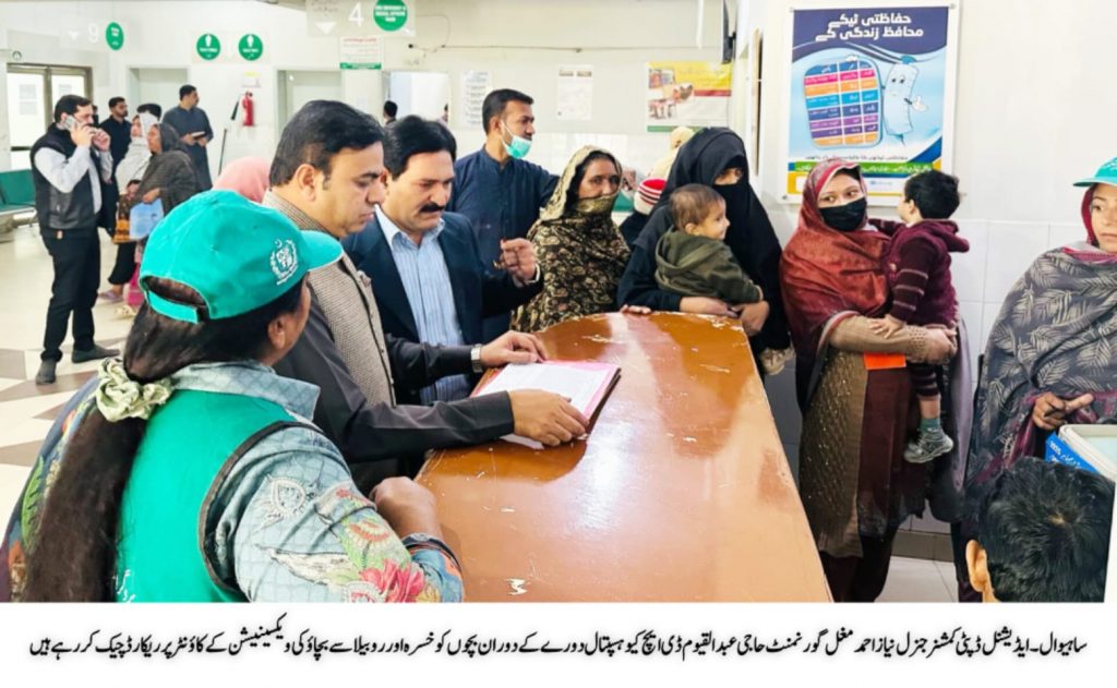 ایڈیشنل ڈپٹی کمشنر جنرل نیاز احمد مغل نے گورنمنٹ حاجی عبدالقیوم ڈسٹرکٹ ہیڈ کوارٹر ہسپتال کا اچانک دورہ کیا-ہسپتال میں موجود روبیلہ اور خسرہ کی ویکسینیشن کے لئے قائم خصوصی کاؤنٹر کا جائزہ لیا اور ریکارڈ چیک کیا۔ جس میں اسسٹنٹ کمشنر ماہم واحد اور سی ای او ہیلتھ ڈاکٹر عبدالمجید نیازی بھی ان کے ہمراہ تھے۔ دورے کے دوران انہوں نے مختلف وارڈز میں زیر علاج مریضوں کی عیادت کی اور فراہم کی جانے والی طبی سہولیات کا تفصیلی جائزہ لیا۔ اے ڈی سی جی نے ڈینگی وارڈ میں داخل مریضوں سے ملاقات کر کے ان کی صحت کے حوالے سے معلومات حاصل کیں اور انہیں بہترین نگہداشت فراہم کرنے کی ہدایت کی۔ انہوں نے خسرہ اور روبیلا سے بچاؤ کی ویکسینیشن کے لئے قائم خصوصی کاؤنٹر کا بھی معائنہ کیا اور ریکارڈ چیک کیا۔ اس موقع پر انہوں نے متعلقہ عملے کو سختی سے ہدایت کی کہ ہسپتال آنے والے ہر بچے کو خسرہ اور روبیلا سے بچاؤ کی حفاظتی ویکسین ضرور لگائی جائے تاکہ بیماریوں کے پھیلاؤ کو روکا جا سکے۔ ایڈیشنل ڈپٹی کمشنر جنرل نے ہسپتال انتظامیہ کو مجموعی سروس ڈیلیوری بہتر بنانے اور مریضوں کو بروقت سہولیات کی فراہمی یقینی بنانے کی بھی ہدایت کی۔بعد ازاں انہوں نے سی ای او ہیلتھ آفس میں خسرہ اور روبیلا سے بچاؤ کی مہم کے جائزہ اجلاس کی صدارت کی۔ انہوں نے ہدایت کی کہ 29 نومبر تک جاری رہنے والی مہم کے دوران پانچ سال سے کم عمر کے تمام بچوں کو حفاظتی ٹیکے لگائے جائیں تاکہ انہیں خسرہ اور روبیلا سے بچایا جا سکے۔