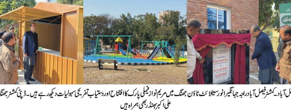 کمشنر نے واسا کے قیام کے بعد عوامی شکایات کے حل اور مثبت عوامی ردِعمل پر اطمینان کا اظہار کرتے ہوئے کہا کہ عوامی خدمت کا یہ تسلسل برقرار رکھا جائے۔ بعد ازاں تحصیل جھنگ کے سیٹلائٹ ٹاؤن میں 30 کنال رقبے پر محیط جدید سہولیات سے آراستہ اسٹیٹ آف دی آرٹ مریم نواز شریف فیملی پارک کو شہریوں کے لیے کھول دیا گیا۔ کمشنر نے پارک کی تزئین و بحالی کا افتتاح کیا اور مختلف تفریحی سہولیات کا جائزہ لیتے ہوئے اسے وزیراعلیٰ پنجاب کی جانب سے شہریوں کے لیے ایک بڑا تحفہ قرار دیا۔