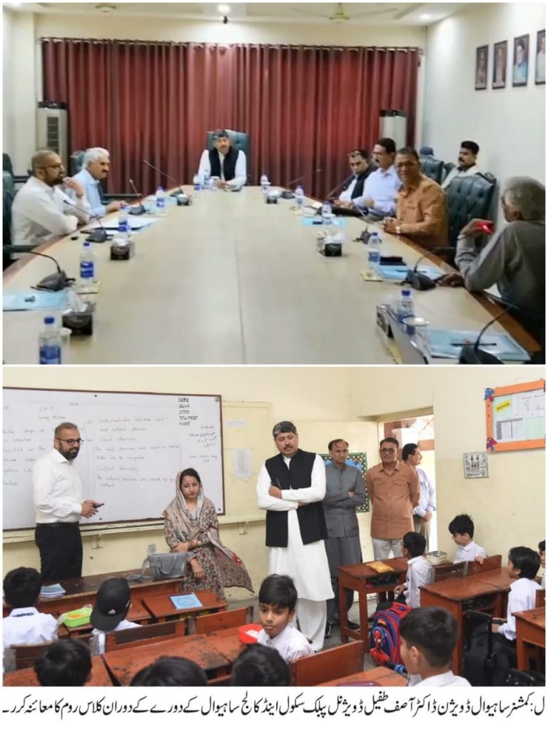 کمشنر ساہیوال ڈویژن ڈاکٹر آصف طفیل کی زیر صدارت ڈویژنل پبلک سکول اینڈ کالج ساہیوال میں ایک اہم اجلاس منعقد ہوا جس میں بورڈ ممبران نے شرکت کی۔ اجلاس کے دوران مختلف سیکشنز کی کارکردگی، تعلیمی معیار اور مارننگ و ایوننگ کلاسز کے حوالے سے تفصیلی جائزہ لیا گیا۔ پرنسپل ڈی پی ایس اکبر علی نے ادارے کی مجموعی کارکردگی، تعلیمی سرگرمیوں اور انتظامی امور پر جامع بریفنگ دی۔ کمشنر ڈاکٹر آصف طفیل نے تعلیمی معیار کو مزید بہتر بنانے پر زور دیتے ہوئے کہا کہ طلبہ کی ہمہ جہت ترقی کے لیے اساتذہ کا کردار نہایت اہم ہے۔ بعد ازاں کمشنر ڈاکٹر آصف طفیل نے سکول کے مختلف کلاس رومز کا دورہ کیا، جہاں انہوں نے طلبہ اور اساتذہ سے نصاب اور تدریسی عمل کے بارے میں دریافت کیا۔ انہوں نے اساتذہ کو ہدایت کی کہ وہ مزید محنت، لگن اور جدید تدریسی طریقوں کے ذریعے طلبہ کی صلاحیتوں کو نکھاریں۔ دورے کے دوران کمشنر نے سکول کی عمارت کے مختلف حصوں کا بھی معائنہ کیا اور بلڈنگ کی بروقت مرمت و دیکھ بھال یقینی بنانے کی ہدایات جاری کیں۔ انہوں نے اس عزم کا اظہار کیا کہ تعلیمی اداروں میں بہترین سہولیات کی فراہمی حکومت کی اولین ترجیح ہے۔