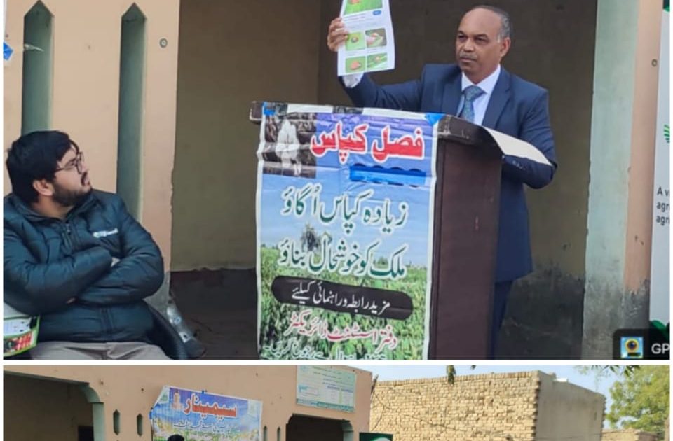 ساہیوال کے گاؤں 130/9-L میں کپاس کی اگیتی کاشت کے موضوع پر ایک میگا اجتماع منعقد کیا گیا۔ پروگرام میں گرد و نواح کے علاقوں کے ترقی پسند کاشتکاروں کی بڑی تعداد نے شرکت کی اور جدید کپاس کی پیداواری ٹیکنالوجی میں گہری دلچسپی کا اظہار کیا۔ اس موقع پر ڈائریکٹر ایگریکلچر ایکسٹینشن (آئی پی ایم) پنجاب ڈاکٹر محمد زاہد نے بطور مہمانِ خصوصی شرکت کی۔ اسسٹنٹ ڈائریکٹر زراعت ڈاکٹر محمد اسلم نے شرکاء کو خوش آمدید کہا اور میگا اجتماع کے انعقاد کے اغراض و مقاصد سے آگاہ کیا۔ انہوں نے اس بات پر زور دیا کہ کپاس کی اگیتی کاشت کے ساتھ ساتھ انٹیگریٹڈ پیسٹ مینجمنٹ (IPM) طریقوں کو اپنانا زیادہ پیداوار کے حصول اور لاگت میں کمی کے لیے نہایت اہم ہے۔ انہوں نے مزید کہا کہ اس قسم کے آگاہی پروگراموں سے بھرپور استفادہ کے لیے کسانوں کی مکمل توجہ اور فعال شرکت ضروری ہے۔ ایگریکلچر آفیسر ایکسٹینشن کمیر عبدالقیوم نے کپاس کی پیداواری ٹیکنالوجی پر ایک جامع اور تکنیکی لیکچر دیا۔ ان کے لیکچر میں زمین کی تیاری، سفارش کردہ اقسام، بیج کی مقدار، کاشت کا موزوں وقت، متوازن کھادوں کا استعمال، آبپاشی کا نظام الاوقات اور کیڑوں کے تدارک کی حکمتِ عملیوں پر تفصیل سے روشنی ڈالی گئی، جبکہ اگیتی کاشت کے فوائد پر خصوصی زور دیا گیا۔ ایگریکلچر آفیسر بایولوجیکل کنٹرول لیبارٹری ساہیوال محترمہ ماریہ تحسین نے پائیدار زرعی نظام میں مفید کیڑوں کے کردار کے بارے میں شرکاء کو آگاہ کیا۔ انہوں نے بایولوجیکل کنٹرول لیبارٹری میں مفید کیڑوں کی افزائش کے عمل کی وضاحت کی اور بتایا کہ مفید کیڑوں کے انڈوں پر مشتمل بایو کارڈز لیبارٹری سے بلامعاوضہ دستیاب ہیں۔ انہوں نے کسانوں کو کیمیائی زرعی زہروں کے بے جا استعمال میں کمی کے لیے حیاتیاتی طریقۂ تدارک اپنانے کی تلقین کی۔ ڈائریکٹر ایگریکلچر ایکسٹینشن ڈاکٹر محمد زاہد نے شرکاء کو مختلف مفید کیڑوں کا عملی مظاہرہ کروایا۔ انہوں نے کسانوں کو ہدایت کی کہ وہ کپاس کی فصل میں آئی پی ایم کے تحت بایو کارڈز کا استعمال یقینی بنائیں تاکہ کیڑوں پر مؤثر اور ماحول دوست طریقے سے قابو پایا جا سکے۔