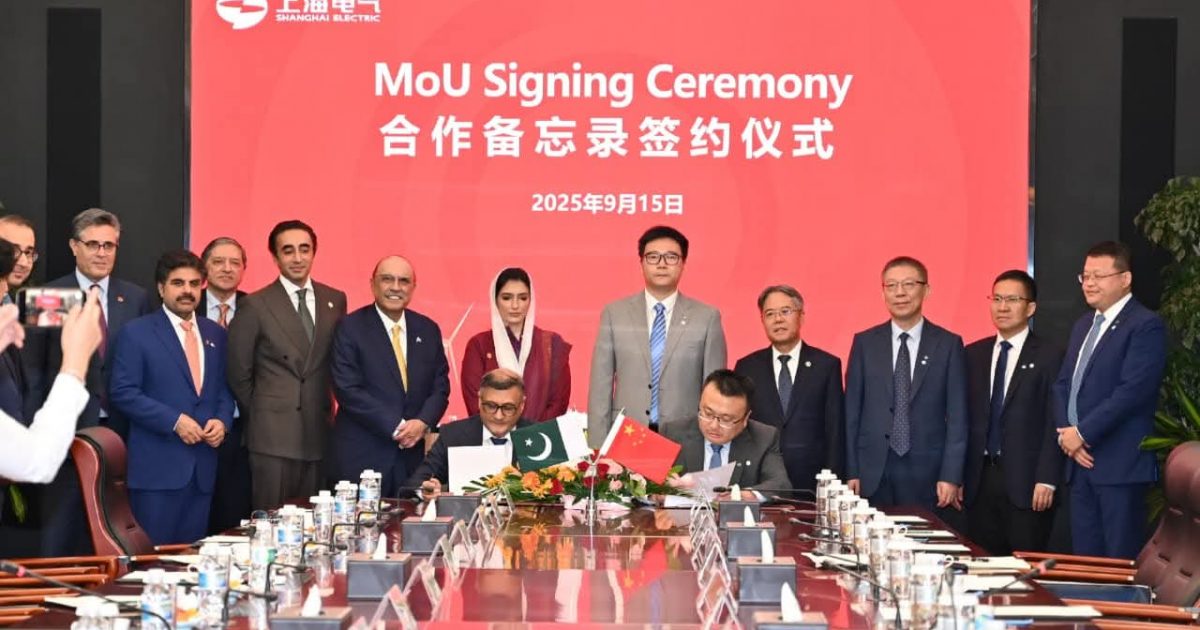 شنگھائی، چین، 15 ستمبر 2025: صدر آصف علی زرداری، خاتون اول بی بی آصفہ بھٹو زرداری اور چیئرمین پی پی پی بلاول بھٹو زرداری نے ایم ایف ٹی سی کول گیسیفیکیشن اینڈ مینوفیکچرنگ (پرائیویٹ) لمیٹڈ کے درمیان ایک مفاہمت کی یادداشت پر دستخط کا مشاہدہ کیا، جس کی قیادت سی ای او مسٹر اور شنگھائی سورس (سندھ شنگھائی) لمیٹڈ شاہد شنووال نے کی۔ الیکٹرک، جس کی نمائندگی سی ای او مسٹر لن جیگن نے کی۔