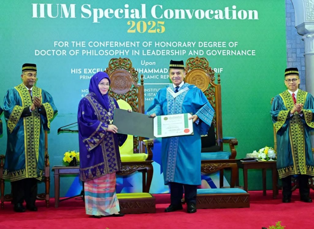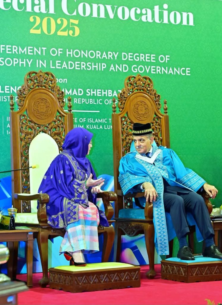 کوالالمپور: وزیر اعظم محمد شہباز شریف کو انٹرنیشنل اسلامک یونیورسٹی ملائیشیا (IIUM) سے لیڈرشپ اینڈ گورننس میں ڈاکٹریٹ کی اعزازی ڈگری دی گئی۔ یہ باوقار ڈگری ان کی قیادت اور حکمرانی کو تسلیم کرتے ہوئے، پہانگ کی ملکہ اور IIUM کی آئینی سربراہ، محترمہ تنکو عزیزہ امینہ میمونہ اسکندریہ نے عطا کی تھی۔