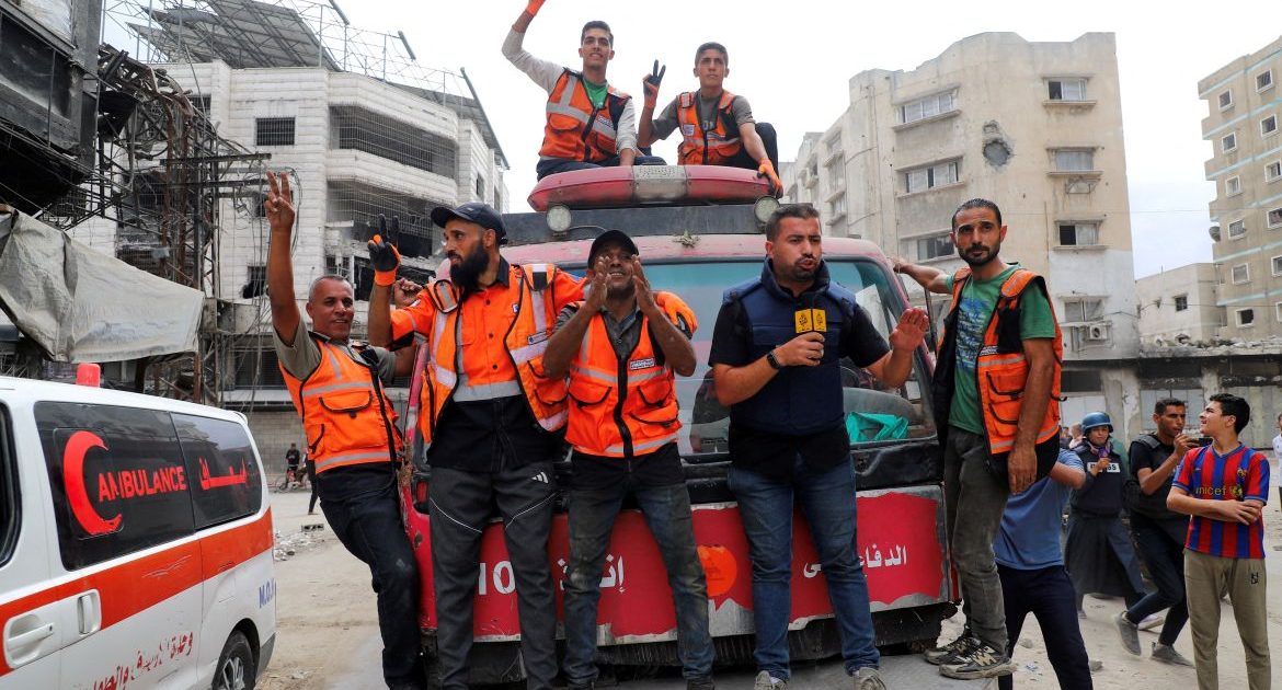 امریکی صدر ڈونلڈ ٹرمپ کے غزہ امن اقدام کے پہلے مرحلے کا حصہ، جنگ بندی اور یرغمالیوں کے معاہدے کے اعلان کے بعد غزہ شہر میں ہنگامی عملے نے سائرن بجائے اور جشن منایا۔ دیر البلاح میں، فلسطینیوں نے جشن کے موقع پر گولیوں کی بارش اور عوامی اجتماعات کے ساتھ جشن منایا۔