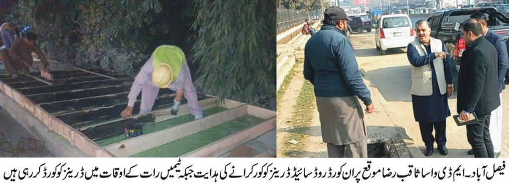 دریں اثناء مینیجنگ ڈائریکٹر واسا ثاقب رضا نے جڑانوالہ روڈ سمیت دیگر شاہرات کا ہنگامی دورہ کیا اور سائیڈ واکس ڈرینز کو کور کرنے کے عمل کا جائزہ لیا۔ انہوں نے متعلقہ ٹیموں کو کام میں تیزی لانے کی ہدایت کرتے ہوئے کہا کہ عوامی جانوں کا تحفظ اولین ترجیح ہے، اس پر کسی قسم کا سمجھوتہ نہیں کیا جائے گا۔