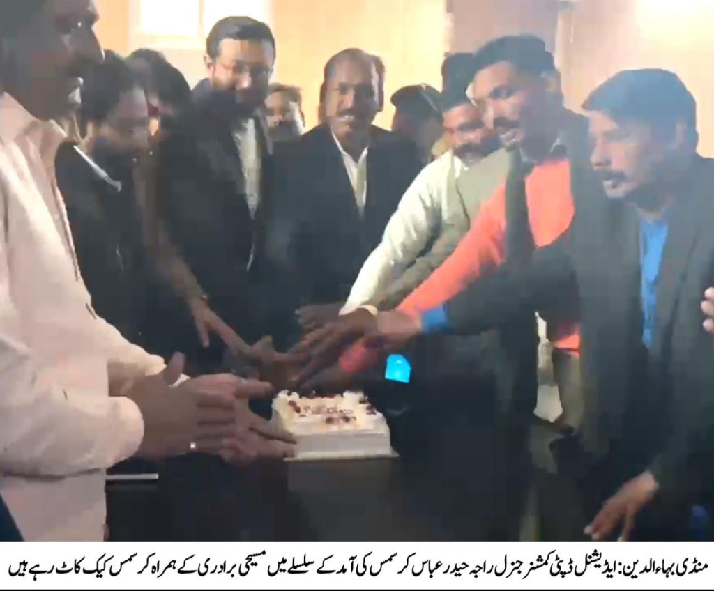 ایڈیشنل ڈپٹی کمشنر جنرل راجہ حیدر عباس کی زیر صدارت کرسمس کی آمد کے سلسلے میں مسیحی برادری اورڈی سی آفس کے مسیحی ملازمین کے ہمراہ کیک کاٹنے کی تقریب کا انعقاد کیا گیا۔ اس موقع پرڈپٹی ڈائریکٹر سوشل ویلفیئر عاطف علی وڑائچ سمیت مسیحی برادری سے تعلق رکھنے والے رہنماﺅں اورڈی سی آفس ملازمین نے شرکت کی۔ایڈیشنل ڈپٹی کمشنر جنرل راجہ حیدر عباس کا کہنا تھا کہ ضلع منڈی بہاءالدین ایک پرامن شہر ہے جہاں تمام اقلیتیں اپنے مذہبی تہوار مل جل کر جوش و جذبہ اور عقیدت کے ساتھ مناتی ہیں اور ایک دوسرے کی خوشیوں میں بھرپور شرکت کرتے ہیں۔ مسیحی برادی نے ہمیشہ محب وطن اور پرامن شہری ہونے کا عملی ثبوت دیا ہے۔ ایڈیشنل ڈپٹی کمشنر کا کہنا تھا کہ حکومت مسیحی کمیونٹی کی فلاح و بہبود کیلئے خطیر رقم خرچ کررہی ہے ، ضلعی انتظامیہ ہر سال کی طرح اس بار بھی مسیحی برادری کی کرسمس کی خوشیوں میں برابر کی شریک ہے اور انہیں کرسمس آمد کی مبارکباد پیش کرتے ہیں۔انہوں نے بتایا کہ ضلعی انتظامیہ کی جانب سے مسیحی بھائیوں کو کرسمس کی خوشیاں منانے کیلئے ضلع کی تینوں تحصیلوں میں چرچوں پر لائٹنگ سمیت سکیورٹی کے بہترین انتظامات کئے گئے ہیں۔ پارکس،کرسچین آبادیوں اور قبرستانوں میں صفائی ستھرائی کیلئے بھر پور اقدامات کئے گئے ہیں ۔اس موقع پر مسیحی برادری کی جانب سے ایڈیشنل ڈپٹی کمشنر کو چند گزارشات بھی پیش کی گئیں جس پر ایڈیشنل ڈپٹی کمشنر نے جائز مطالبات کو جلد حل کرنے کی یقین دہانی کرائی۔