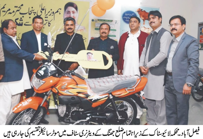 تقریب میں ضلع جھنگ کے 62 ویٹرنری آفیسرز میں موٹر سائیکلز تقسیم کی گئیں جو بلا سود آسان اقساط پر فراہم کی جا رہی ہیں۔ اس اقدام کا مقصد فیلڈ میں نقل و حرکت کو بہتر بنانا، دور دراز دیہی علاقوں تک بروقت رسائی یقینی بنانا اور ویٹرنری خدمات کے مجموعی معیار کو مزید بہتر کرنا ہے۔ یہ پروگرام محکمہ لائیوسٹاک پنجاب کی اس پالیسی کا حصہ ہے جس کے تحت عوام کو ان کی دہلیز پر معیاری اور بروقت ویٹرنری سہولیات فراہم کرنے کے لیے انفراسٹرکچر اور فیلڈ سپورٹ کو مضبوط بنایا جا رہا ہے۔