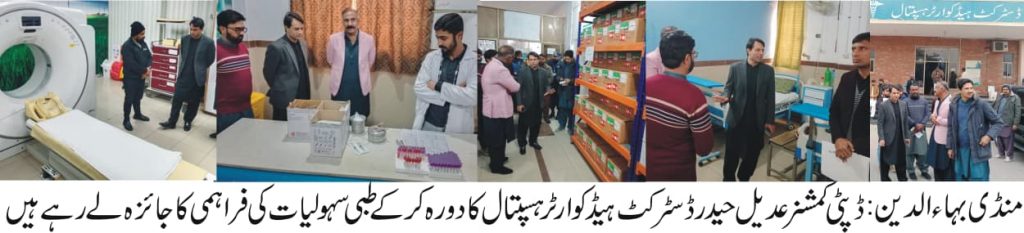 ڈپٹی کمشنر عدیل حیدر نے ڈسٹرکٹ ہیڈکوارٹر ہسپتال منڈی بہاؤالدین کا اچانک دورہ کیا، انہوں نے ہسپتال کے مختلف شعبہ جات کا معائنہ کرتے ہوئے فراہم کی جانے والی طبی سہولیات، صفائی ستھرائی، واش رومز، طبی آلات، ایمرجنسی، ایکسرے مشین، سی ٹی سکین مشین، ادویات کی دستیابی سمیت دیگر سہولیات کا تفصیلی جائزہ لیا۔ ڈپٹی کمشنر نے وارڈز میں داخل مریضوں اور موقع پر موجود ان کے عزیز و اقارب سے خیریت دریافت کرتے ہوئے ڈاکٹرز و طبی عملہ کے رویے، ادویات کی فراہمی اور طبی سہولیات کے بارے میں بھی استفسار کیا اور اپنے اطمینان کا اظہار کیا