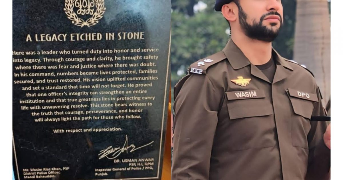 ڈسٹرکٹ پولیس آفیسر منڈی بہاؤالدین وسیم ریاض خان کی شاندار کارکردگی۔ آئی جی پنجاب ڈاکٹر عثمان انور نے اپنے ہاتھ سے خط لکھ کر خوبصورت پتھر پر کندہ کر کے ڈی پی او وسیم ریاض خان کو تحفے میں دیا۔ آئی جی کا ڈی پی او منڈی بہاؤالدین وسیم ریاض خان کو شاندار الفاظ میں خراج تحسین۔ انسپکٹر جنرل آف پولیس پنجاب ڈاکٹر عثمان انور نے ضلع منڈی بہاؤالدین میں امن و امان کے قیام، جرائم کی شرح میں تاریخی کمی اور پولیس کے نظم و ضبط میں نمایاں بہتری کے لیے ڈسٹرکٹ پولیس آفیسر وسیم ریاض خان PSP کی شاندار خدمات کا باضابطہ اعتراف کیا۔ آئی جی پنجاب نے ڈی پی او وسیم ریاض خان کو خراج تحسین پیش کیا اور انہیں ایک یادگاری تختی پیش کی جس پر یہ جملے سنہری حروف میں کندہ ہیں: وہ ایک ایسے لیڈر تھے جنہوں نے ڈیوٹی کو عزت اور خدمت کو میراث میں بدل دیا۔ ان کی ایمانداری نے ادارے کو وقار بخشا اور ان کی عظمت ہر اس جان کی حفاظت میں مضمر ہے جس کی حفاظت کے لیے وہ ہمیشہ کوشاں رہے۔ اس موقع پر آئی جی پنجاب ڈاکٹر عثمان انور نے کہا کہ ڈی پی او وسیم ریاض خان جیسے ایماندار، پیشہ ور اور پرعزم افسران محکمہ پولیس کا اصل اثاثہ ہیں۔ ان کی قیادت میں منڈی بہاؤالدین پولیس نے مثالی کارکردگی کا مظاہرہ کرتے ہوئے عوام کا اعتماد بحال کیا اور جرائم پیشہ عناصر کے لیے میدان تنگ کر دیا۔ ڈی پی او وسیم ریاض خان کی قیادت میں ضلع بھر میں نہ صرف جرائم کی شرح میں نمایاں کمی ہوئی بلکہ پولیس اور عوام کے درمیان اعتماد اور تعاون کے نئے دور کا آغاز بھی ہوا جو ان کی قیادت کی شفافیت، وژن اور عوام دوستی کا واضح ثبوت ہے۔ یہ اعزاز نہ صرف ایک افسر کی کامیابی ہے بلکہ محکمہ پولیس کی عزت اور وقار میں اضافے کا سبب بھی ہے۔ آئی جی پولیس پنجاب ڈاکٹر عثمان انور نے ڈی پی او وسیم ریاض خان کو خوبصورت پتھر پر خوبصورت تحریر سے مزین تختی پیش کی ہے۔ سینئر صحافی بیورو چیف ضلع منڈی بہاؤالدین، سماء لاہور کے نمائندہ پی ٹی وی نیوز منڈی بہاؤالدین راجہ محمد ایوب نے ڈی پی او وسیم ریاض خان کو مبارکباد دی ہے۔