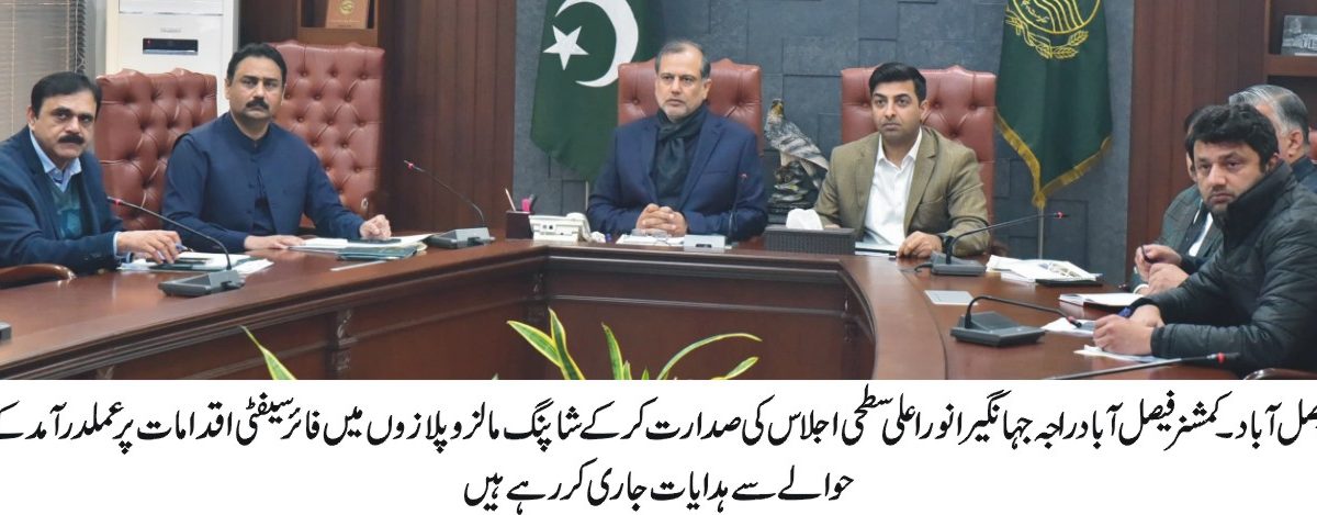 کمشنر فیصل آباد راجہ جہانگیر انور نے اس حوالے سے منعقدہ اجلاس کی صدارت کرتے ہوئے ہدایت کی کہ مالز، پلازوں، فیکٹریز اور کاروباری عمارات سے فائر سیفٹی اقدامات مکمل ہونے کے باقاعدہ سرٹیفکیٹس حاصل کیے جائیں، جبکہ فائر سیفٹی انتظامات کی جانچ کے لیے آڈٹ کا نظام بھی نافذ کیا جائے۔