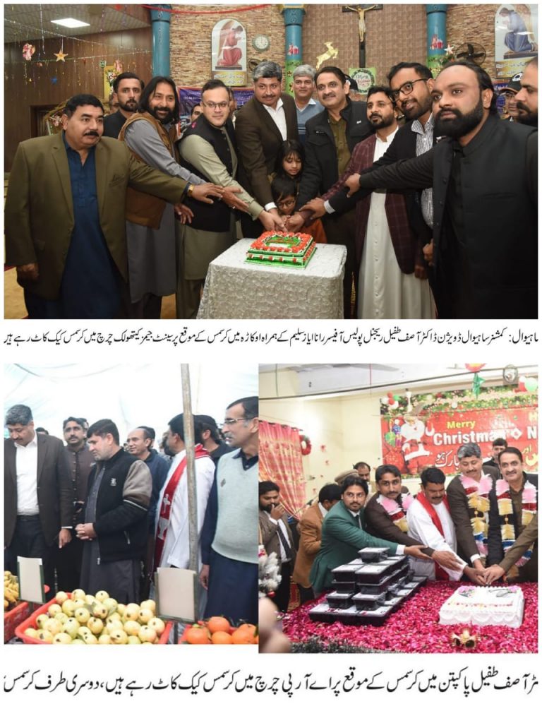 کمشنر ساہیوال ڈویژن ڈاکٹر آصف طفیل نے کرسمس کے موقع پر پاکپتن اور اوکاڑہ کا دورہ کیا جہاں انہوں نے مسیحی برادری کی خوشیوں میں بھرپور شرکت کی۔ اس موقع پر ریجنل پولیس آفیسر ساہیوال رانا ایاز سلیم بھی ان کے ہمراہ تھے۔کمشنر ساہیوال ڈویژن نے پاکپتن اور اوکاڑہ میںمسیحی بھائیوں کے ہمراہ کرسمس کے کیک کاٹے، انہیں تحائف دیے اور عیدی بھی تقسیم کی ۔ انہوں نے مسیحی برادری کو کرسمس کی مبارکباد دیتے ہوئے کہا کہ اقلیتی برادریوں کے حقوق کا تحفظ اور ان کی خوشیوں میں شریک ہونا حکومت پنجاب کی اولین ترجیحات میں شامل ہے۔ڈاکٹر آصف طفیل نے کہا کہ پاکستان میں تمام مذاہب کے ماننے والوں کو مکمل مذہبی آزادی حاصل ہے اور حکومت اقلیتوں کی فلاح و بہبود کے لیے عملی اقدامات کر رہی ہے۔ انہوں نے اس بات پر زور دیا کہ باہمی احترام، رواداری اور اتحاد ہی ایک مضبوط اور پرامن معاشرے کی بنیاد ہے۔دورے کے دوران کمشنر ساہیوال ڈویژن نے پاکپتن اور اوکاڑہ کرسمس سہولت بازاروں کا بھی معائنہ کیا اور وہاں لگائے گئے مختلف سٹالز کا تفصیلی جائزہ لیا۔ انہوں نے سہولت بازاروں میں اشیائے ضروریہ کی دستیابی، قیمتوں، معیار اور صفائی کے انتظامات کاجائزہ لیا ور متعلقہ افسران کو ہدایت کی کہ شہریوں کو زیادہ سے زیادہ ریلیف فراہم کیا جائے، خصوصاً تہوار کے موقع پر کسی قسم کی غفلت برداشت نہیں کی جائے گی۔آر پی او رانا ایاز سلیم نے اس موقع پر سکیورٹی انتظامات کا جائزہ لیتے ہوئے کہا کہ کرسمس کے موقع پر گرجا گھروں، سہولت بازاروں اور عوامی مقامات پر فول پروف سکیورٹی انتظامات کیے گئے ہیں تاکہ شہری بلا خوف و خطر اپنی خوشیاں منا سکیں۔مسیحی برادری کے نمائندوں نے کمشنر ساہیوال ڈویژن اور صوبائی حکومت کا شکریہ ادا کرتے ہوئے کہا کہ کرسمس کی خوشیوں میں انتظامیہ کی شرکت اور سہولیات کی فراہمی کو یقینی بنایاگیا ہے-