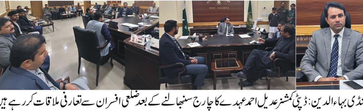 منڈی بہاؤالدین میں تعینات ہونے والے نئے ڈپٹی کمشنر عدیل حیدر نے اپنے عہدے کا چارج سنبھال کر کام شروع کر دیا ہے۔ دفتر آمد پر سینئر افسران اور سٹاف نے ان کا استقبال کیا۔ایڈیشنل ڈپٹی کمشنر ریونیو محمد جعفر چوہدری،ایڈیشنل ڈپٹی کمشنر جنرل راجہ حیدر عباس ، اسسٹنٹ کمشنر عدنان بشیر وڑائچ ، سی ای او ایجوکیشن ضیاءاللہ عباسی ، سی ای او ہیلتھ ڈاکٹر کرن ارشد ، ڈسٹرکٹ آفیسر انڈسٹریز رانا سعید اللہ خان،چیف آفیسر میونسپل کمیٹی رضوان بشیر آغا، چیف آفیسر ضلع کونسل محمد فیاض وڑائچ اور دیگر افسران بھی موجود تھے ۔ڈپٹی کمشنر نے ضلعی افسران کے ساتھ مختصر تعارفی ملاقات کی ۔اس موقع پر ان کا کہنا تھا کہ سرکاری افسران کی بنیادی ذمے داری عوام کے مسائل کا فوری حل اور ان کی مشکلات کا خاتمہ ہے۔تمام افسران صبح 9بجے دفاتر میں اپنی حاضری کو یقینی بنائیں اور شہریوں کو ریلیف فراہم کرنے کیلئے اپنے فرائض ایمانداری اور تندہی سے سرانجام دیں ۔ کسی بھی محکمہ میں کرپشن کو ہر گز برداشت نہیں کیا جائے گا۔ سائلین کیلئے میرے دفتر کے دروازے ہمہ وقت کھلے رہیں گے ۔ ضلع منڈی بہاﺅالدین کو ایک ماڈل ضلع بنانے کی بھر پور کوشش کی جائے گی جس کیلئے تمام افسران کے ساتھ ، سول سوسائٹی، میڈیا سمیت تمام شعبہ ہائے زندگی سے وابستہ افراد کا تعاون حاصل کیا جائے گا۔