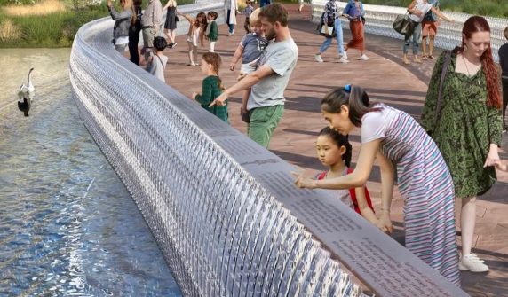 لندن میں کوئین الزبتھ میموریل مجسموں اور شیشے کے پل کو نمایاں کرنے کے لیے
