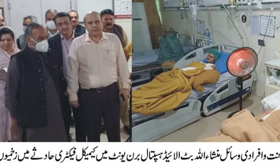 صوبائی وزیر محنت منشاء اللہ بٹ کا الائیڈ ہسپتال فیصل وزیر نے طبی سہولیات کا جائزہ لیا، رہائشی علاقوں میں فیکٹری کی اجازت نہ دینے کی ہدایت، ڈیوٹی میں غفلت پر افسر معطلآباد کا دورہ، کیمیکل فیکٹری حادثے کے زخمیوں کی عیادت