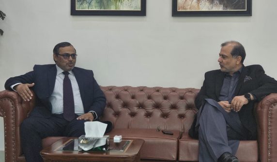 وفاقی وزیر برائے تخفیفِ غربت و سماجی تحفظ پیر سید عمران احمد شاہ کی اپنے آفس میں سی ای او یوتھ ورلڈ سپورٹس کمانڈر آفتاب اقبال سے ملاقات